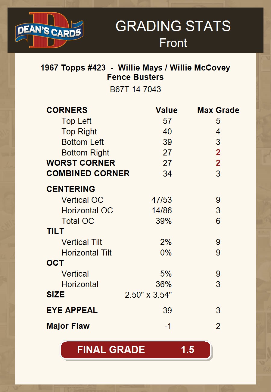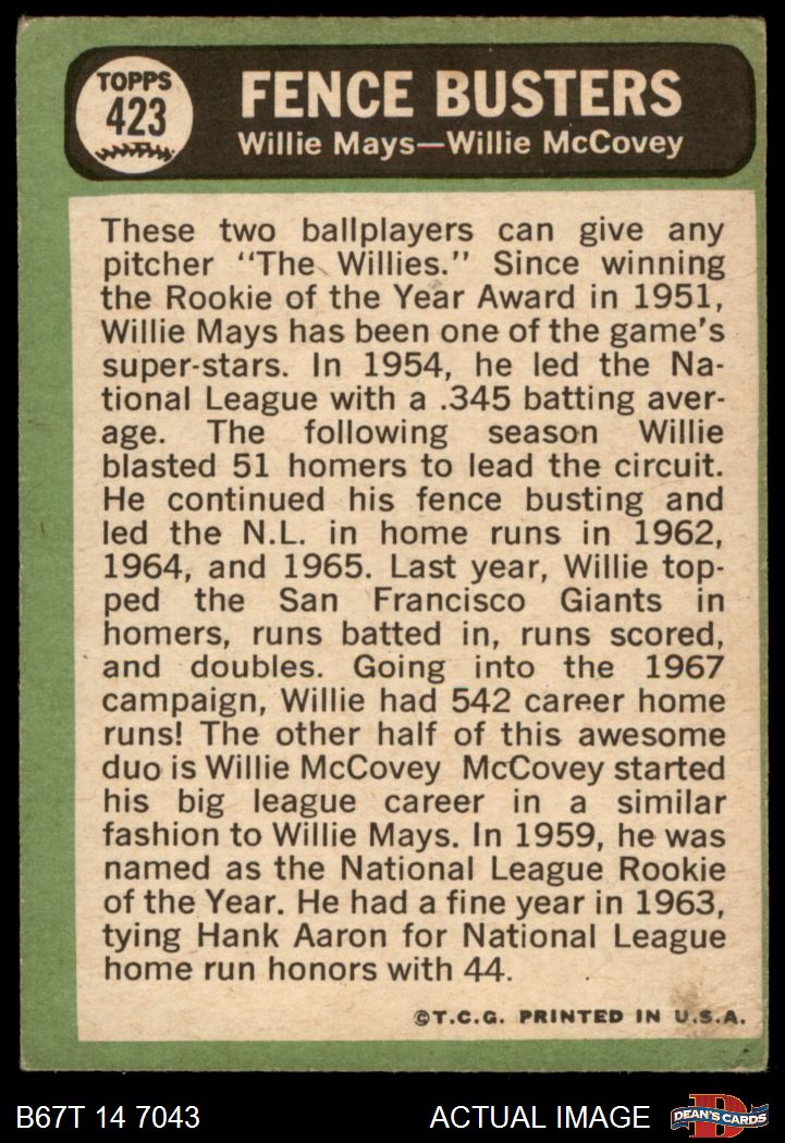 1967 Topps #423 - Willie Mays / Willie McCovey Fence Busters 1.5 - FAIR