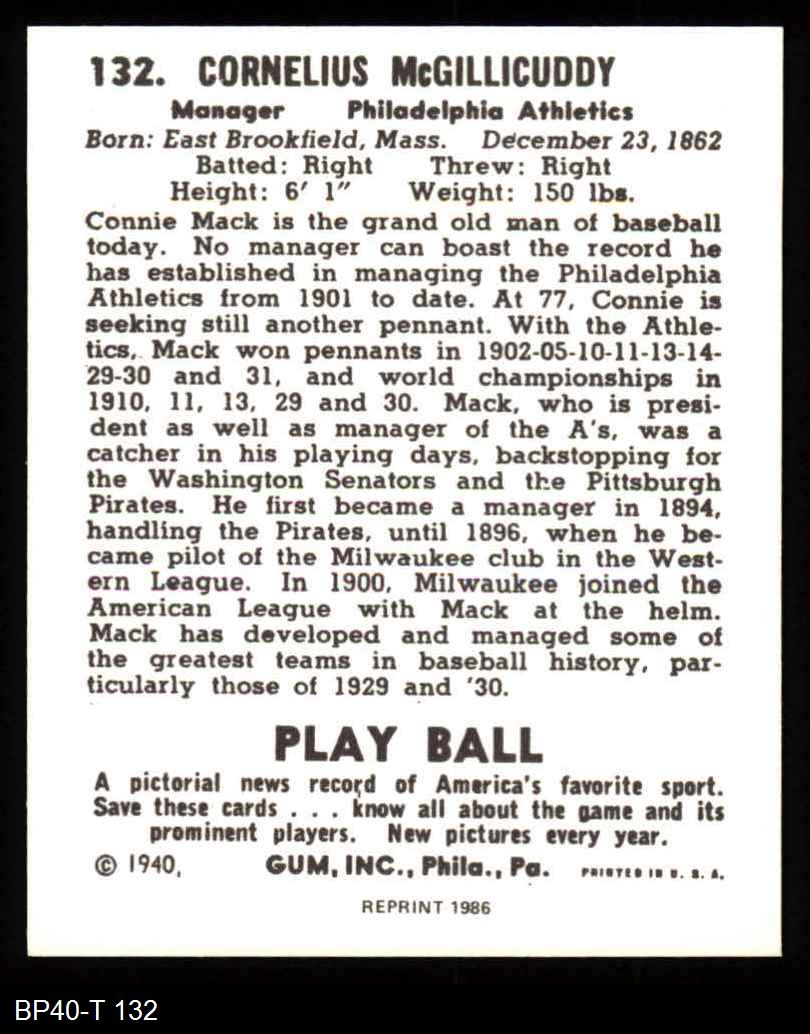 1940 Play Ball Reprint #132 Connie Mack 8 - NM/MT