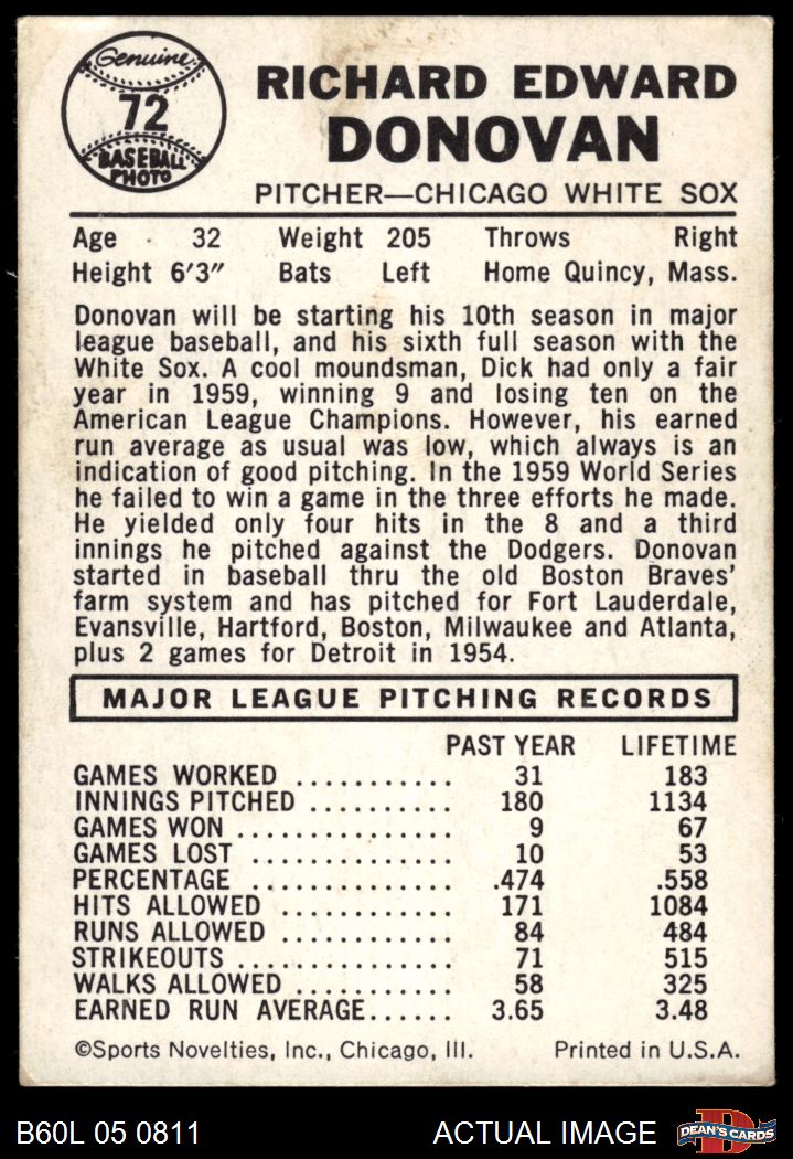 1960 Leaf #72 SML Dick Donovan 2.5 - GD+