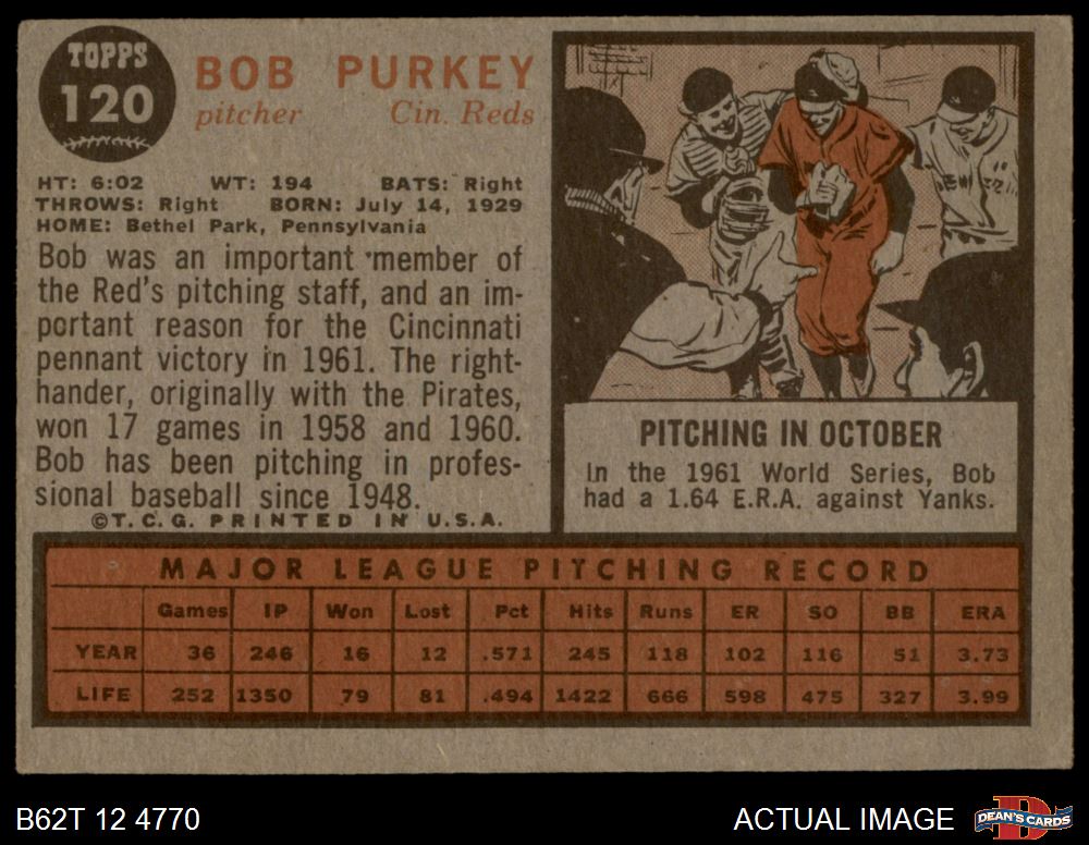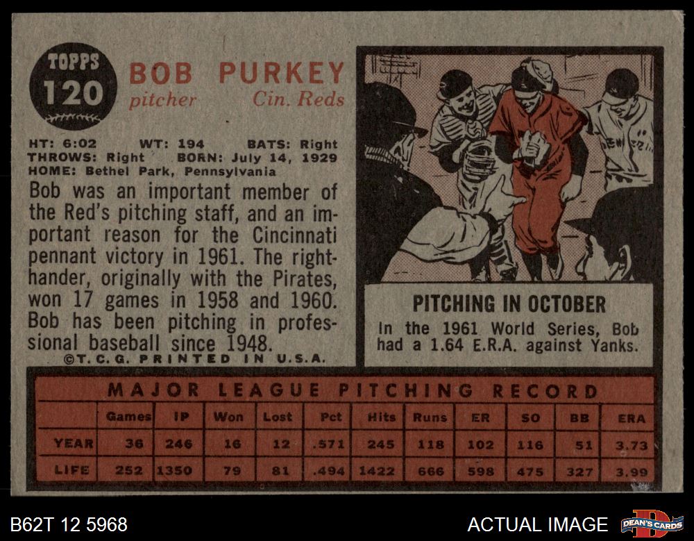 1962 Topps #120 GRN Bob Purkey 3 - VG