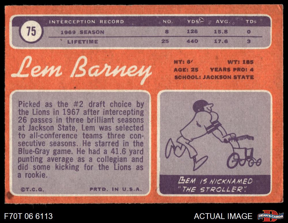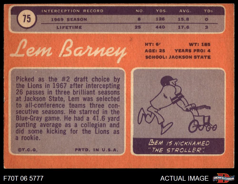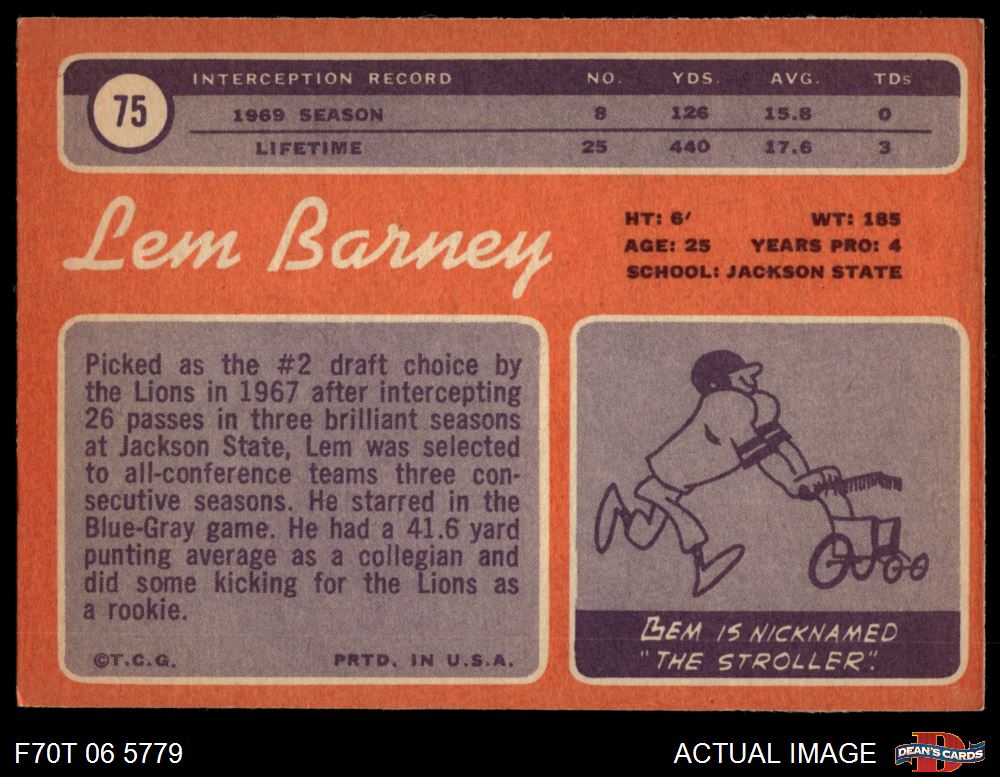 1970 Topps #75 Lem Barney 4 - VG/EX