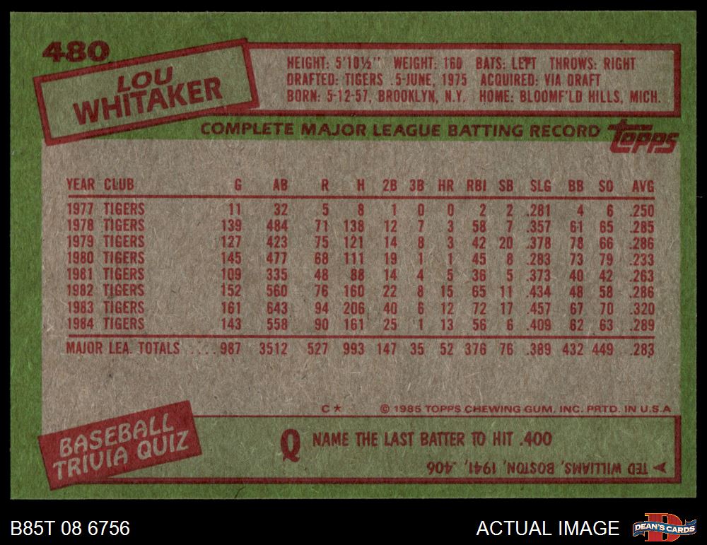 1985 Topps #480 Lou Whitaker