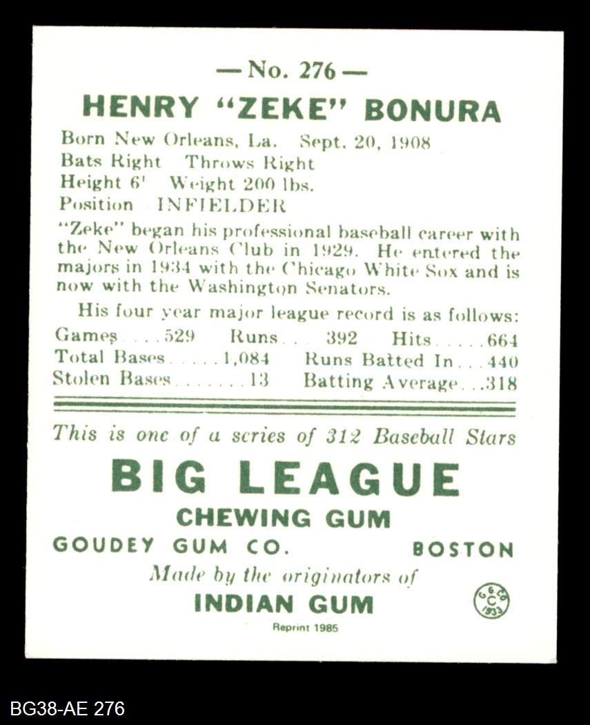 1938 Goudey Heads-Up Reprint #276 Zeke Bonura