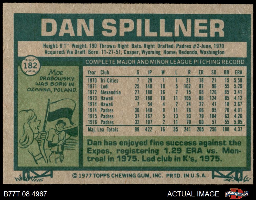 1977 Topps #182 Dan Spillner 4 - VG/EX