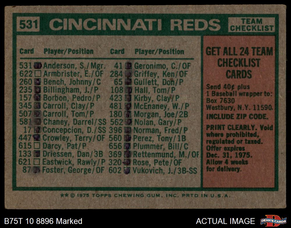 1975 Topps #531  -  Sparky Anderson Reds Team Checklist Front Thumbnail