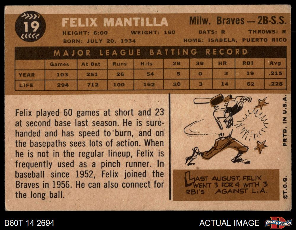 1960 Topps #19 Felix Mantilla 2 - GOOD