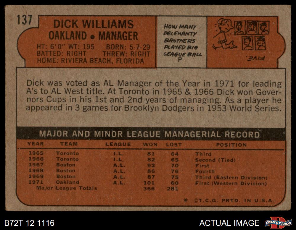 1972 Topps #137 Dick Williams 1.5 - FAIR
