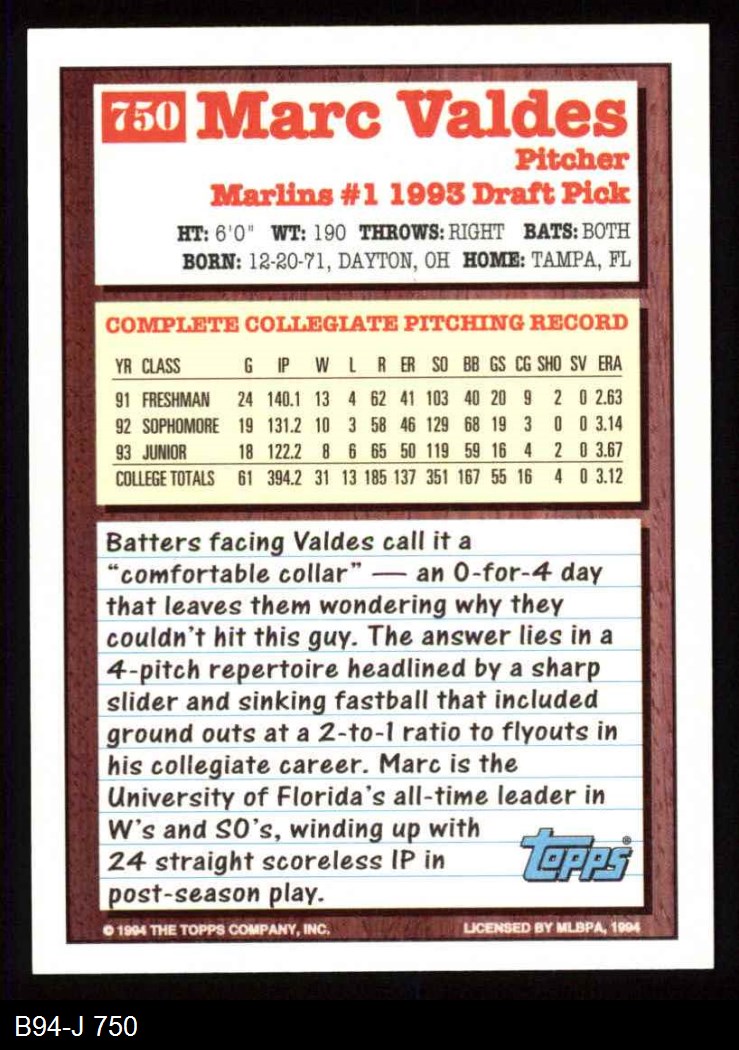1994 Topps #750 - Marc Valdes Draft Pick 8 - NM/MT