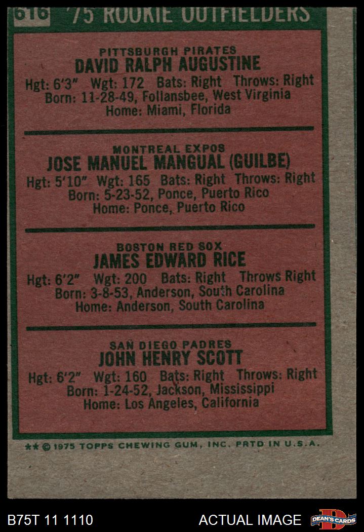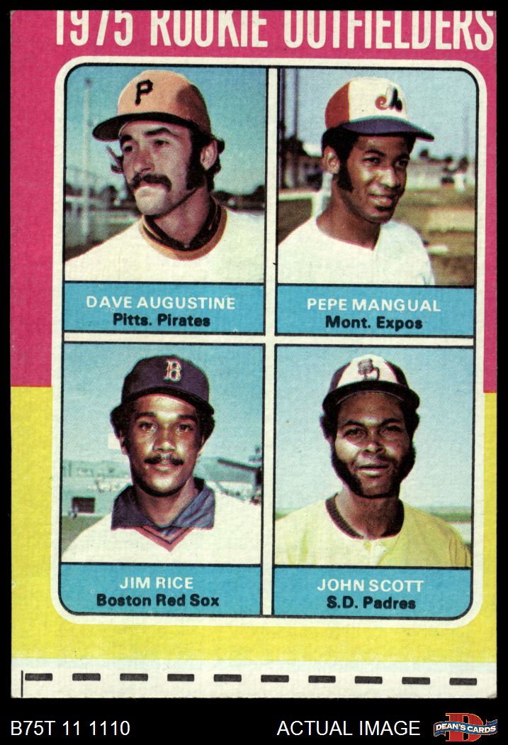 1975 Topps #616  -  Jim Rice / Dave Augustine / Pepe Mangual / John Scott Rookie Outfielders Front Thumbnail