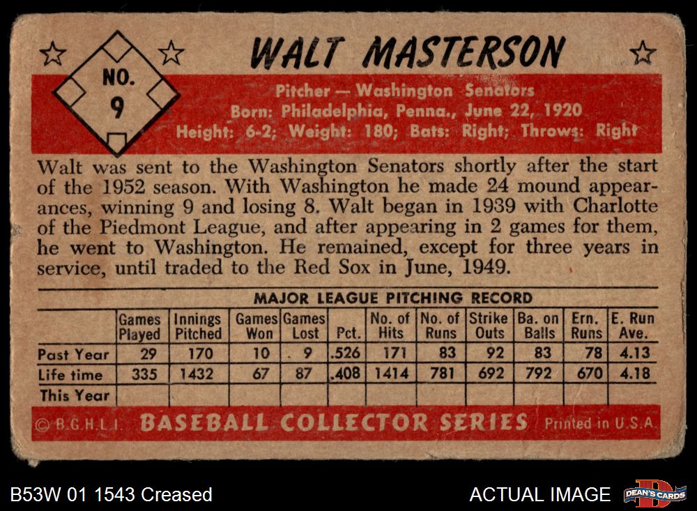 1953 Bowman B&W #9 Walt Masterson 1 - POOR