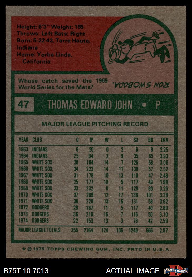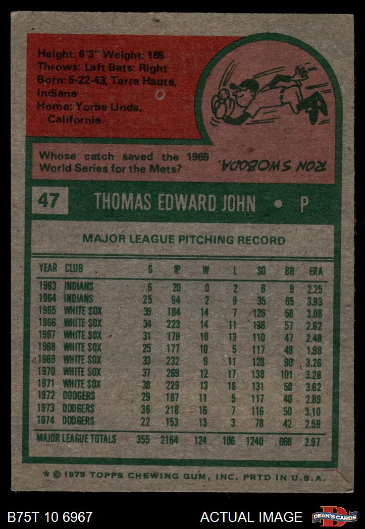 1975 Topps #47 Tommy John 4 - VG/EX