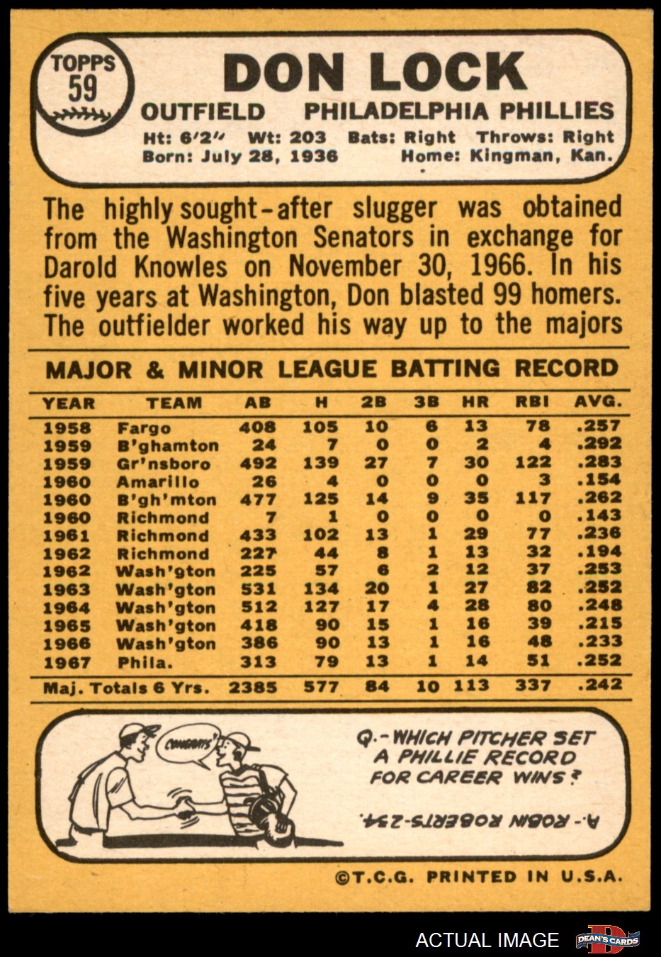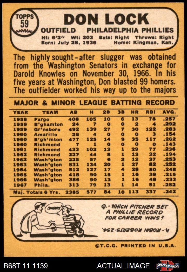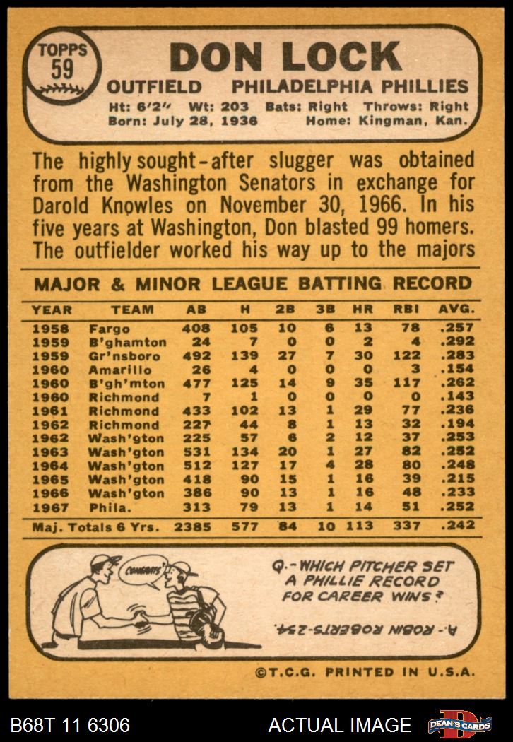 1968 Topps #59 Don Lock 8 - NM/MT