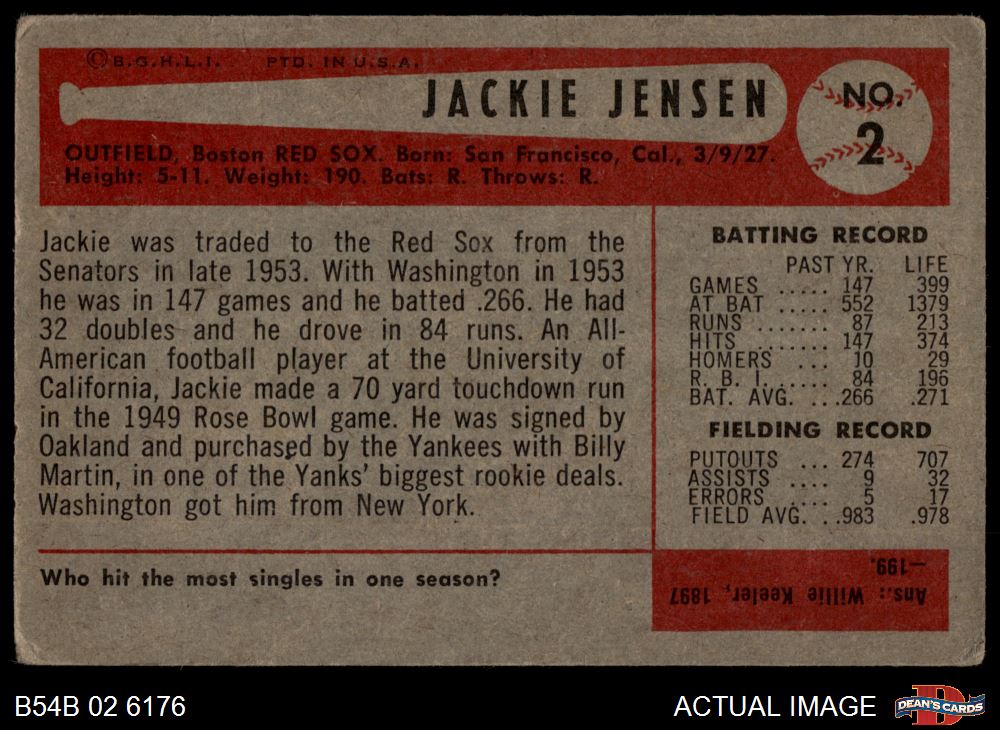 1954 Bowman #2 Jackie Jensen 2 - GOOD