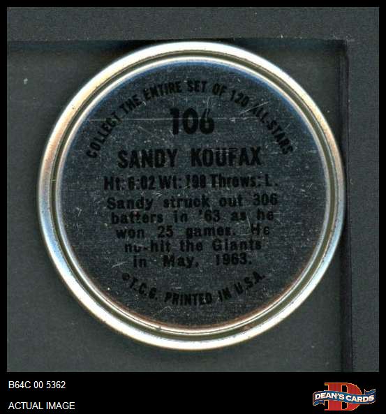 1964 Topps Coins #106 Sandy Koufax 5 - EX