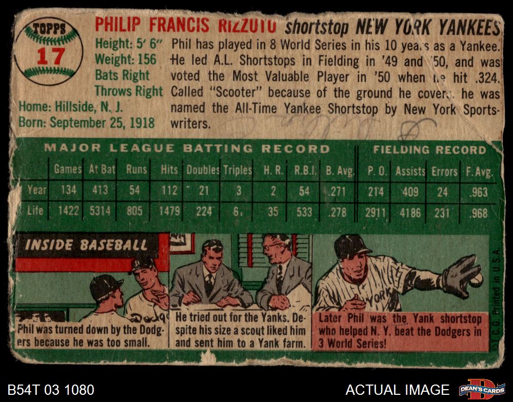 1954 Topps #17 WHT Phil Rizzuto AUTHENTIC