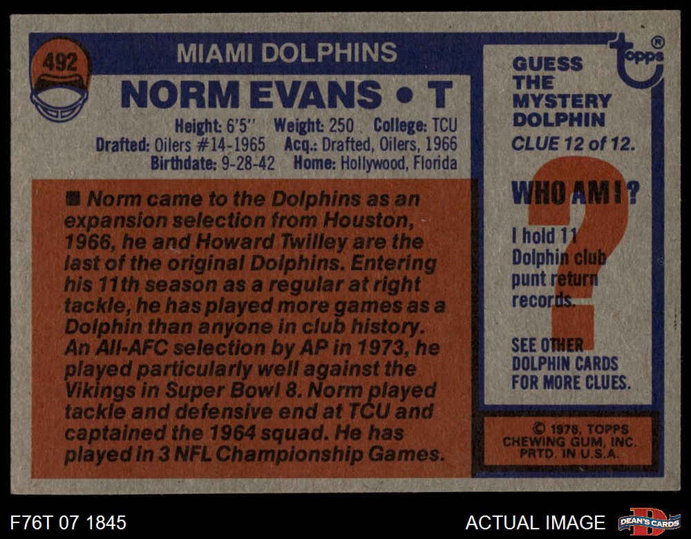 1976 Topps #492 Norm Evans 5 - EX
