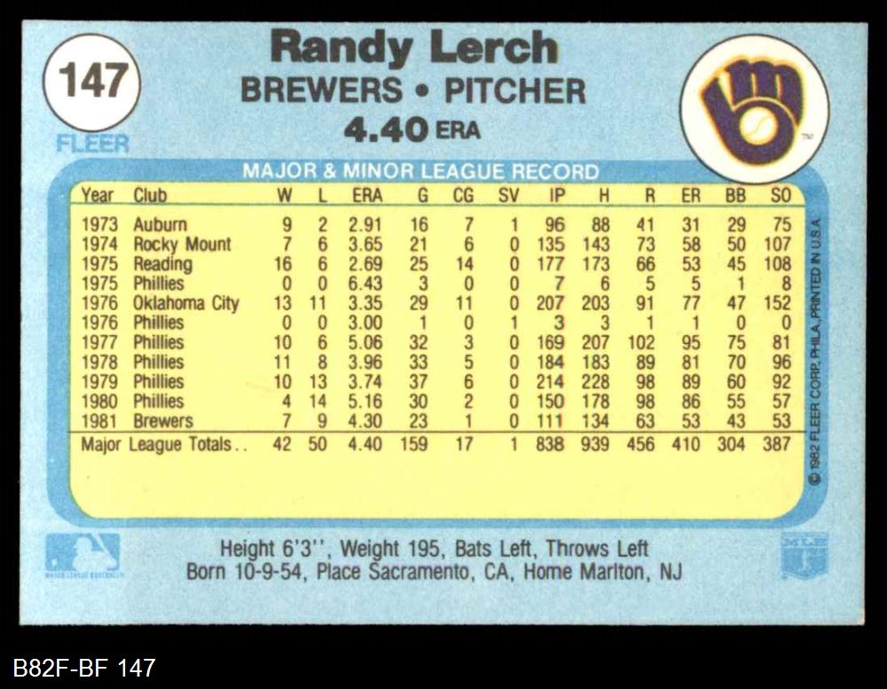 1982 Fleer #147 Randy Lerch