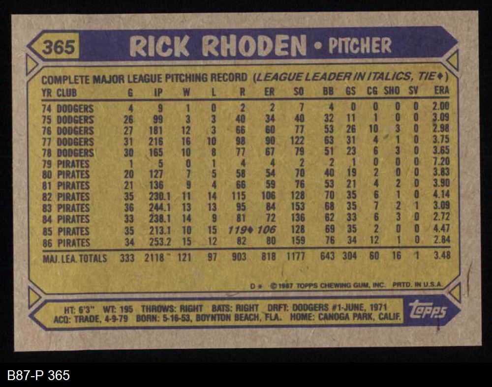 1987 Topps #365 Rick Rhoden 8 - NM/MT