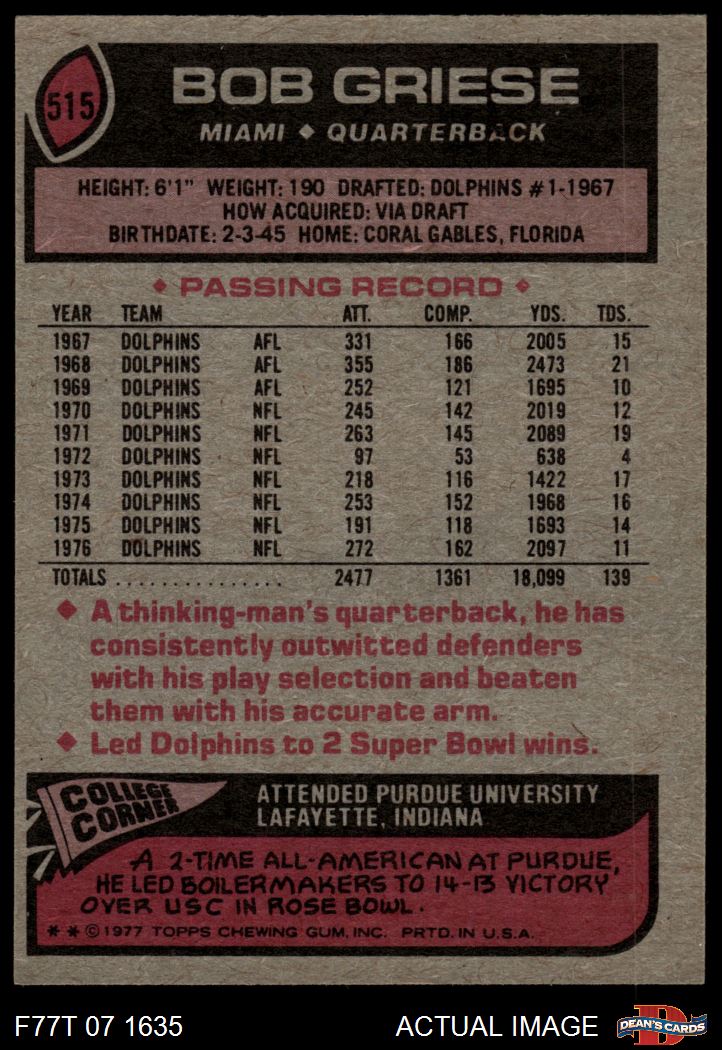 1977 Topps #515 Bob Griese 5 - EX