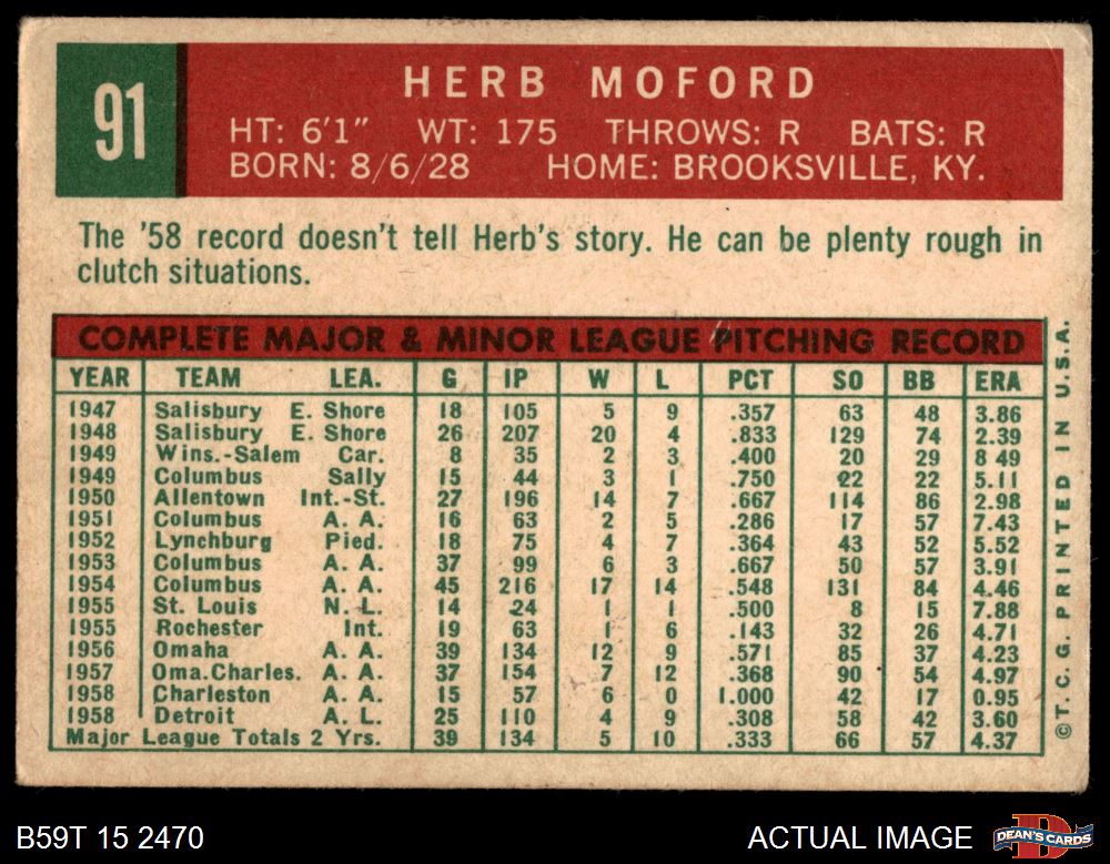 1959 Topps #91 Herb Moford 2 - GOOD