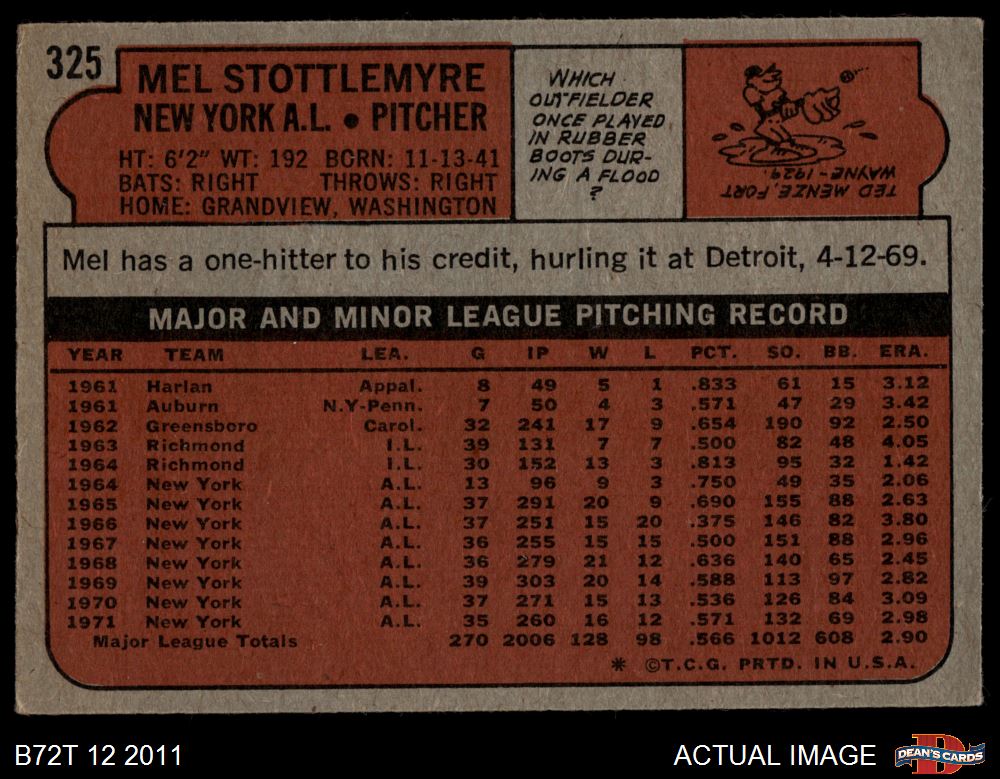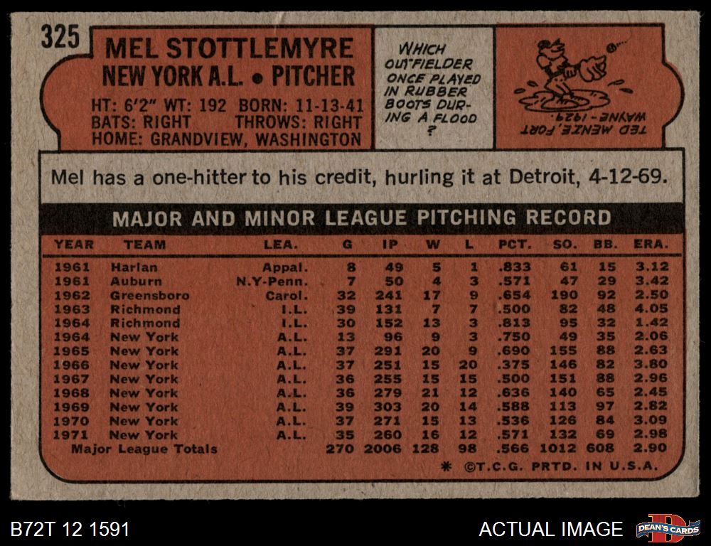 1972 Topps #325 Mel Stottlemyre 4 - VG/EX