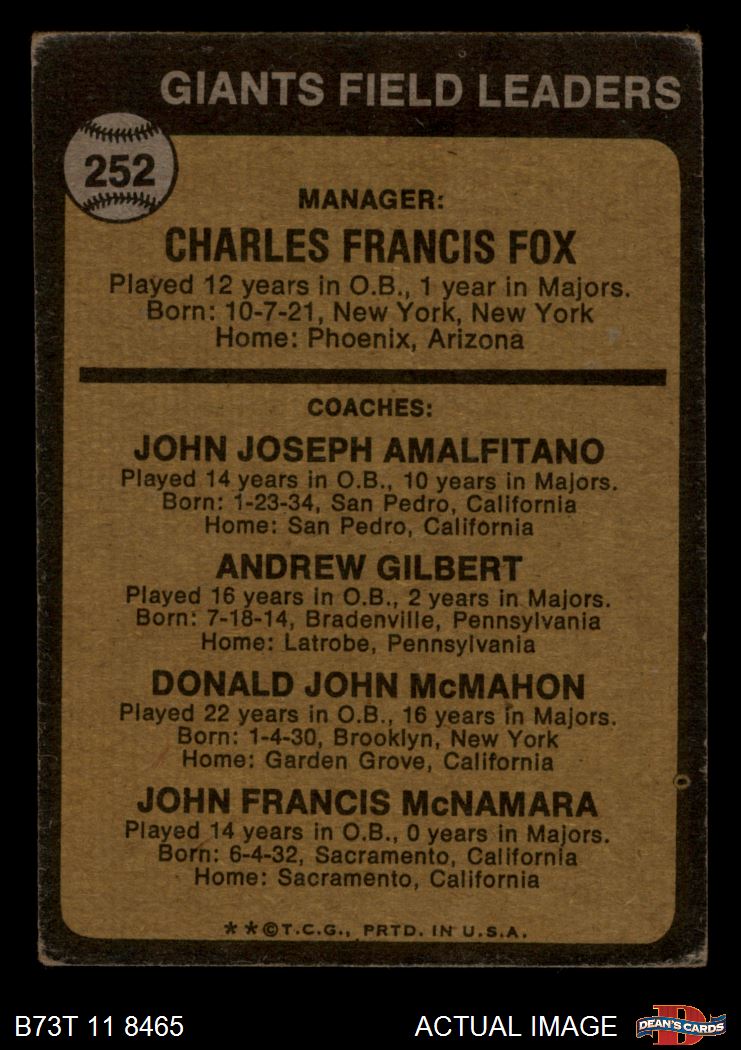 1973 Topps #252 BRN - Charlie Fox / Joe Amalfitano / Andy Gilbert / Don McMahon / John McNamara Giants Leaders 2 - GOOD