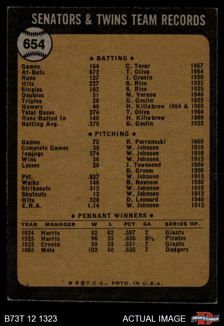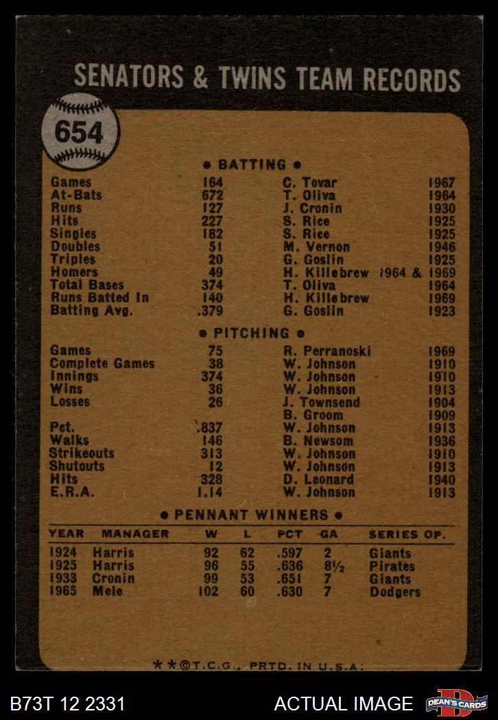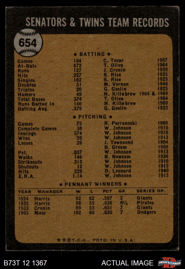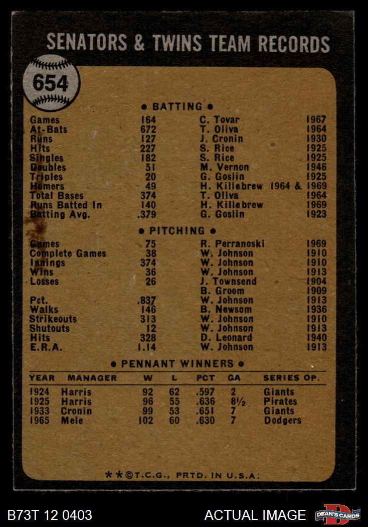 1973 Topps #654 Twins Team 3 - VG