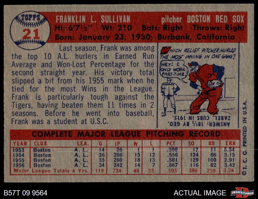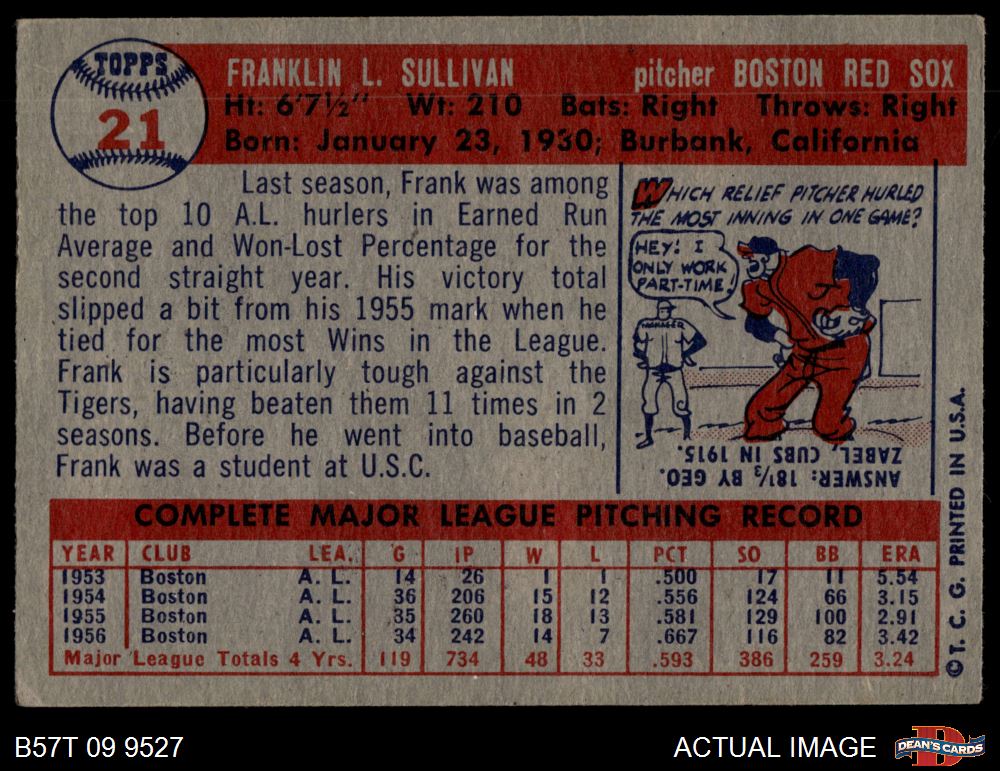 1957 Topps #21 Frank Sullivan 3 - VG