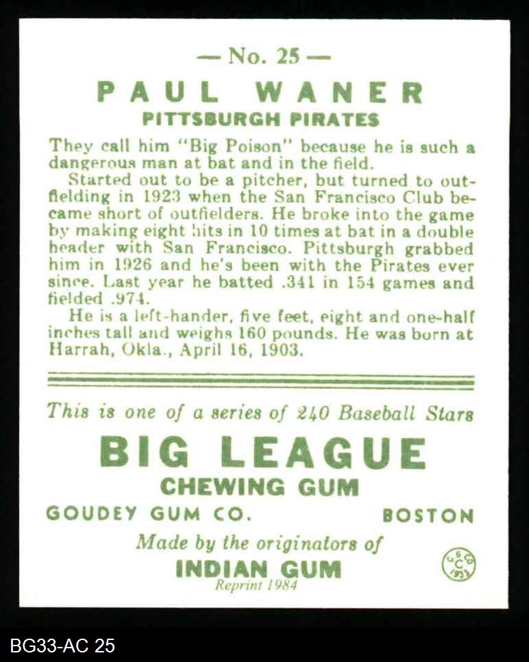 1933 Goudey Reprint #25 Paul Waner 8 - NM/MT