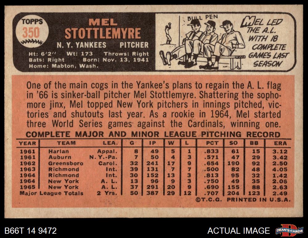 1966 Topps #350 Mel Stottlemyre 4.5 - VG/EX+