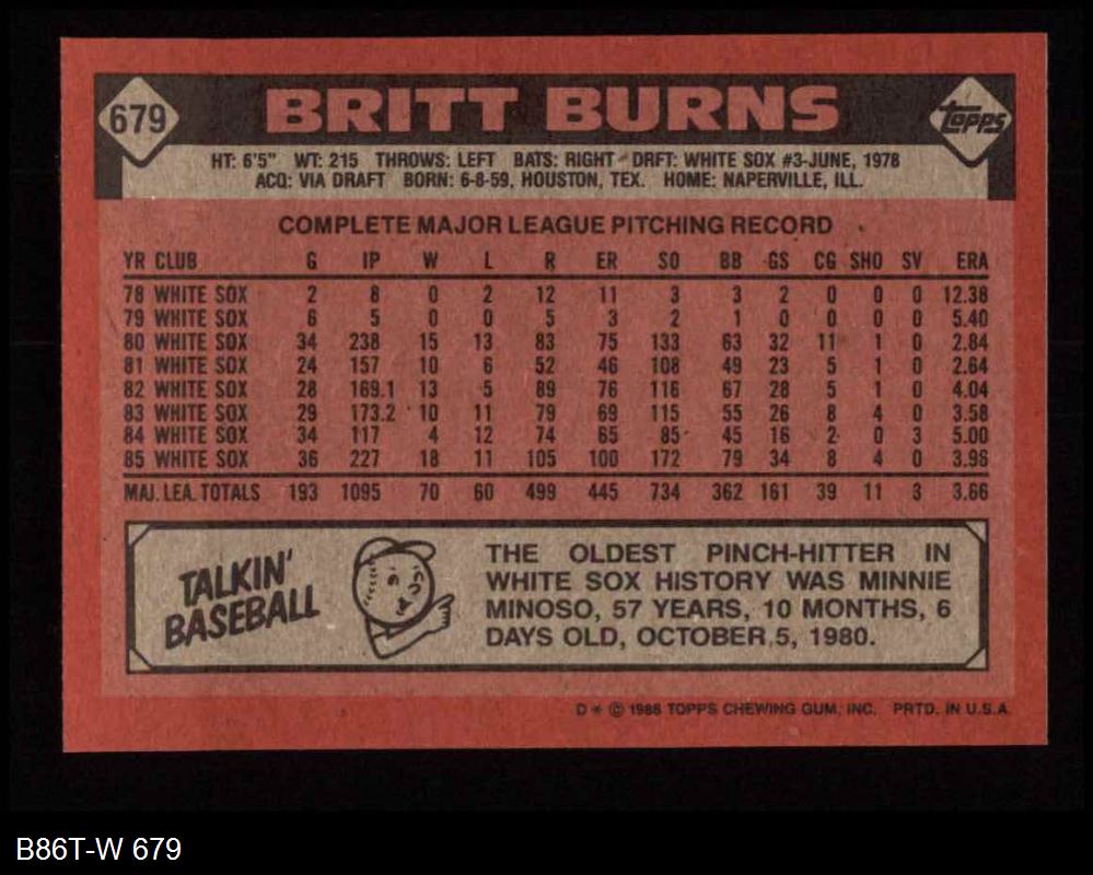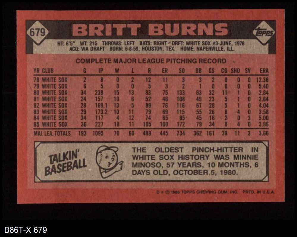 1986 Topps #679 Britt Burns 8 - NM/MT