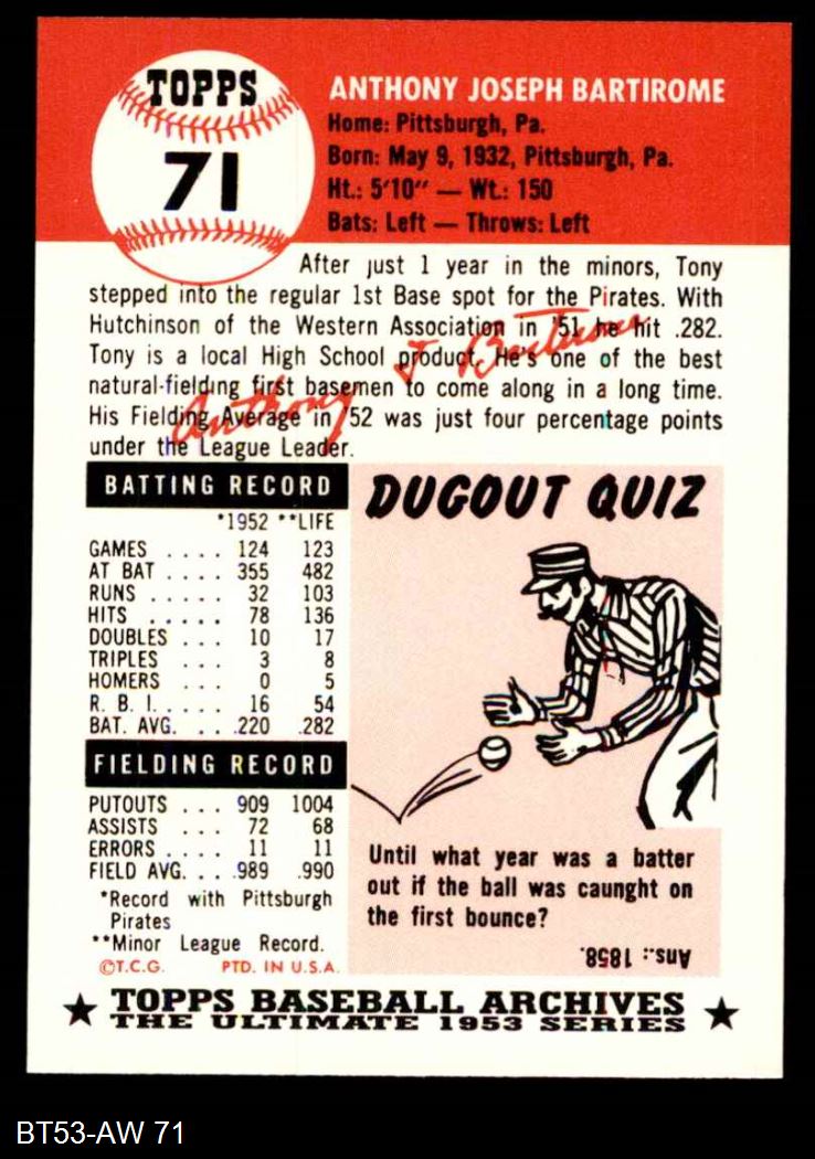 1953 Topps Archives #71 Tony Bartirome 8 - NM/MT