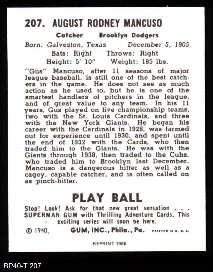 1940 Play Ball Reprint #207 Gus Mancuso