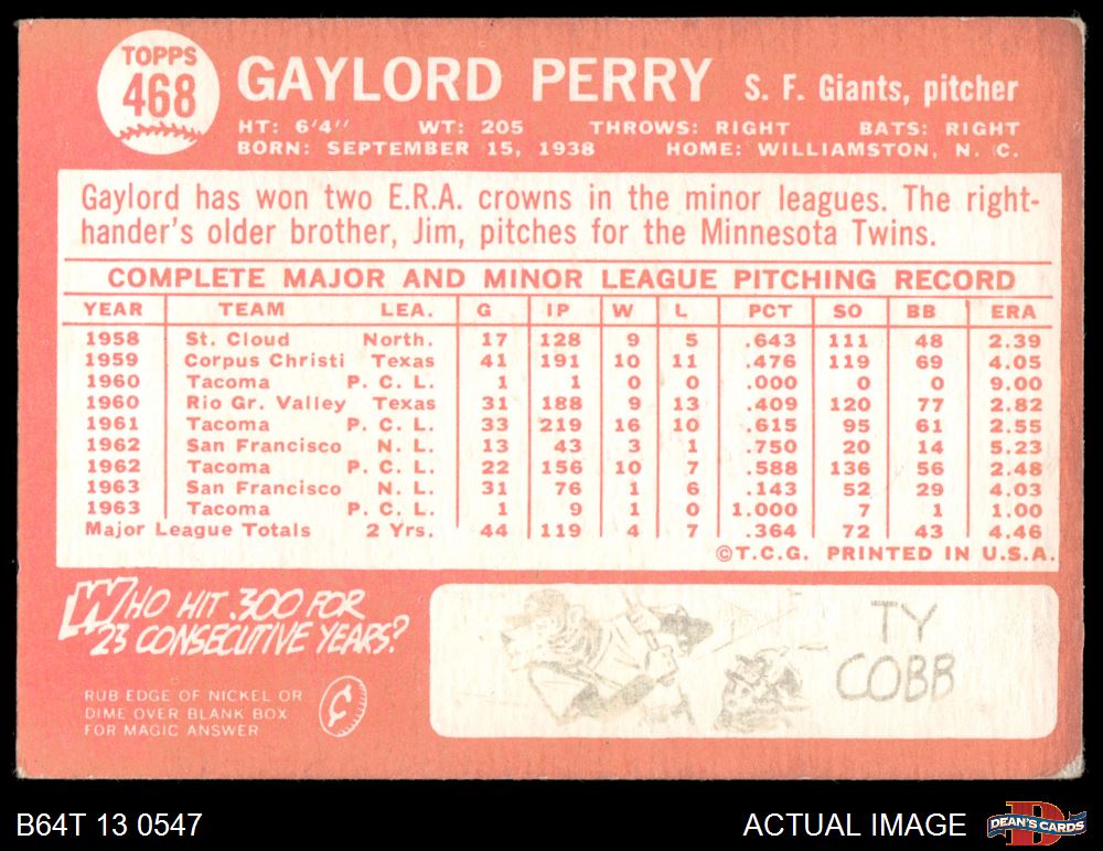 1964 Topps #468 Gaylord Perry 3 - VG
