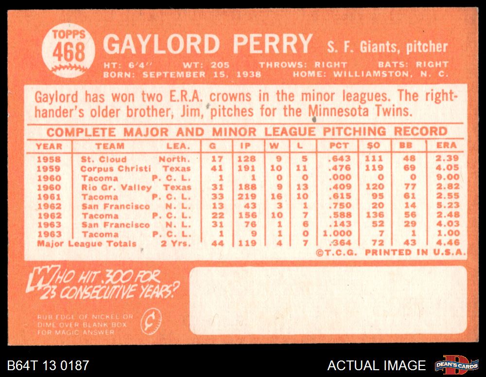 1964 Topps #468 Gaylord Perry 6 - EX/MT