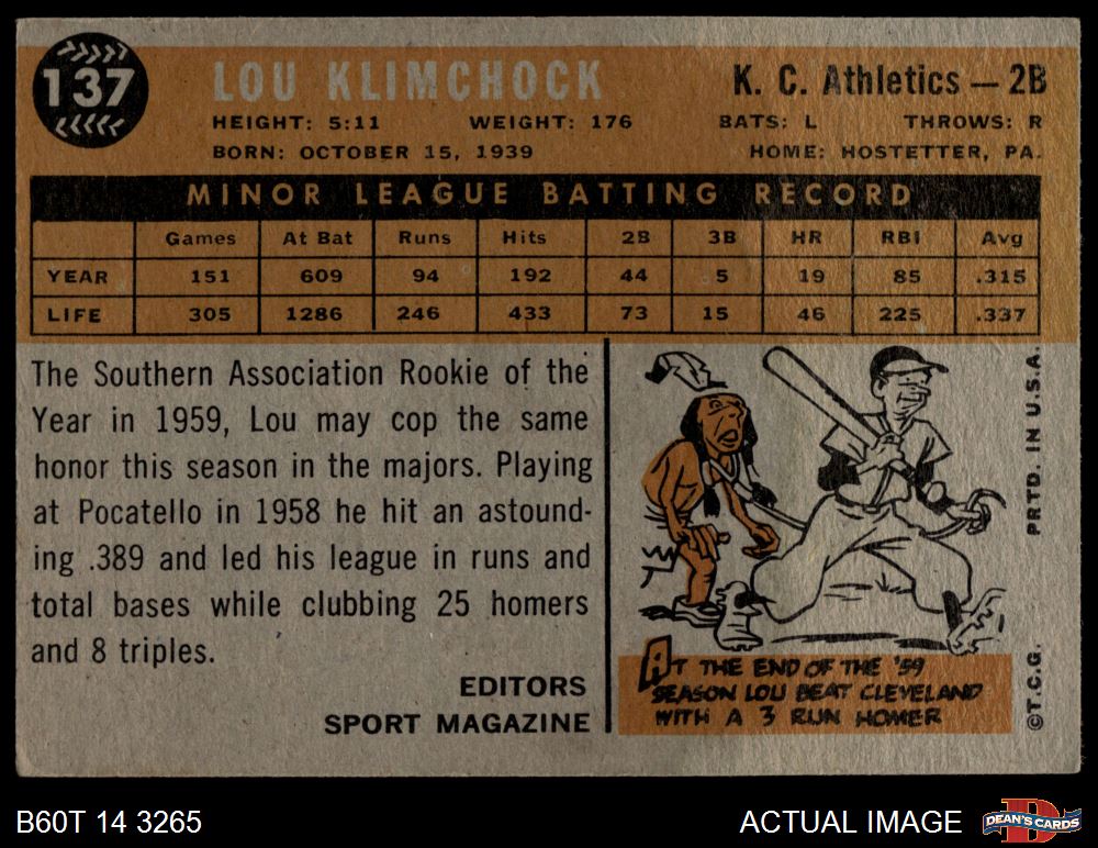 1960 Topps #137 - Lou Klimchock Rookie Star 2 - GOOD