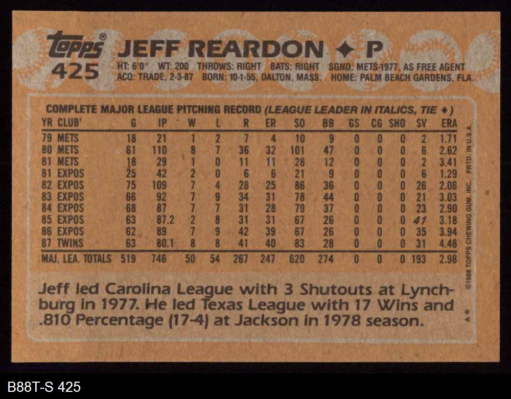 1988 Topps #425 Jeff Reardon