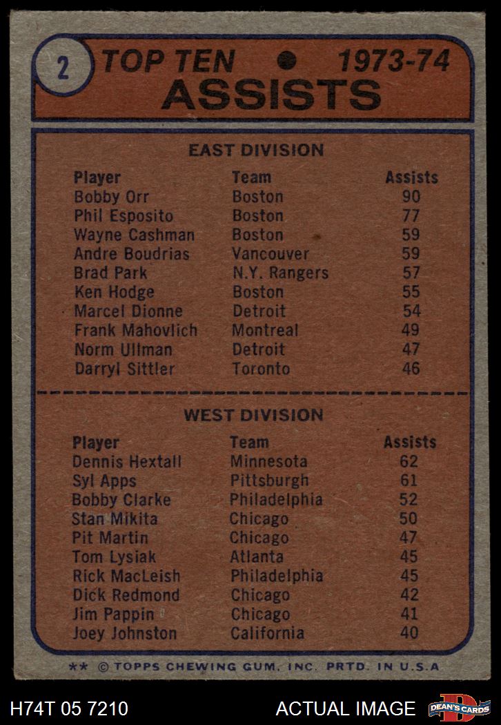 1974 Topps #2 - Bobby Orr / Dennis Hextall Assists Leaders 4 - VG/EX