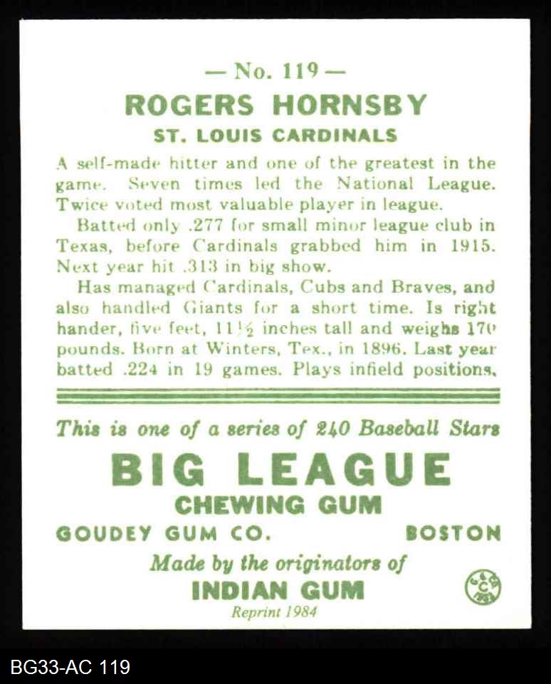 1933 Goudey Reprint #119 Rogers Hornsby 8 - NM/MT