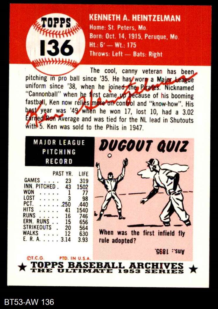 1953 Topps Archives #136 Ken Heintzelman 8 - NM/MT