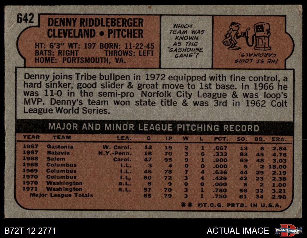 1972 Topps #642 Dennis Riddleberger 3.5 - VG+