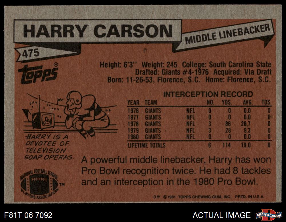 1981 Topps #475 Harry Carson 5 - EX