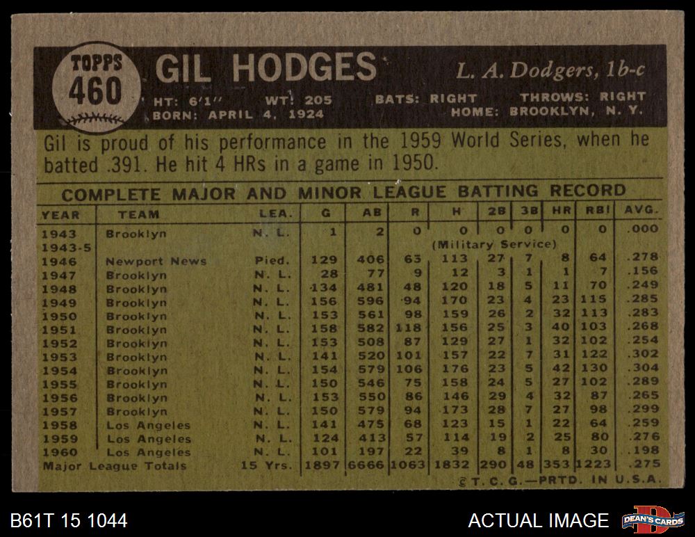 1961 Topps #460 Gil Hodges 3 - VG