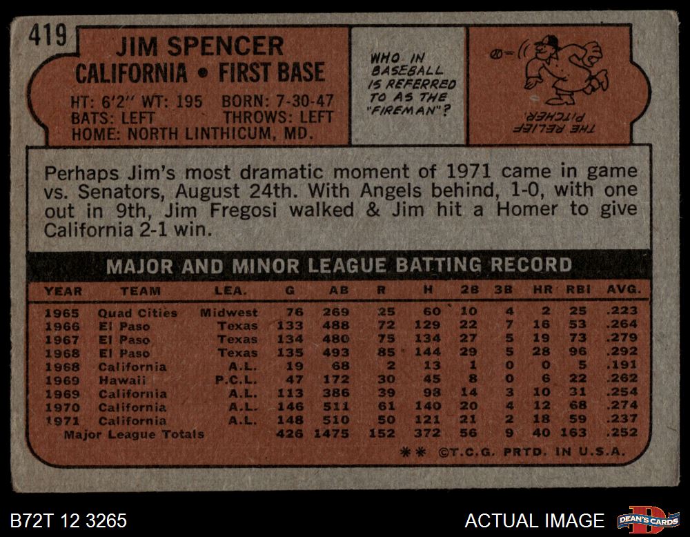 1972 Topps #419 Jim Spencer 1 - POOR