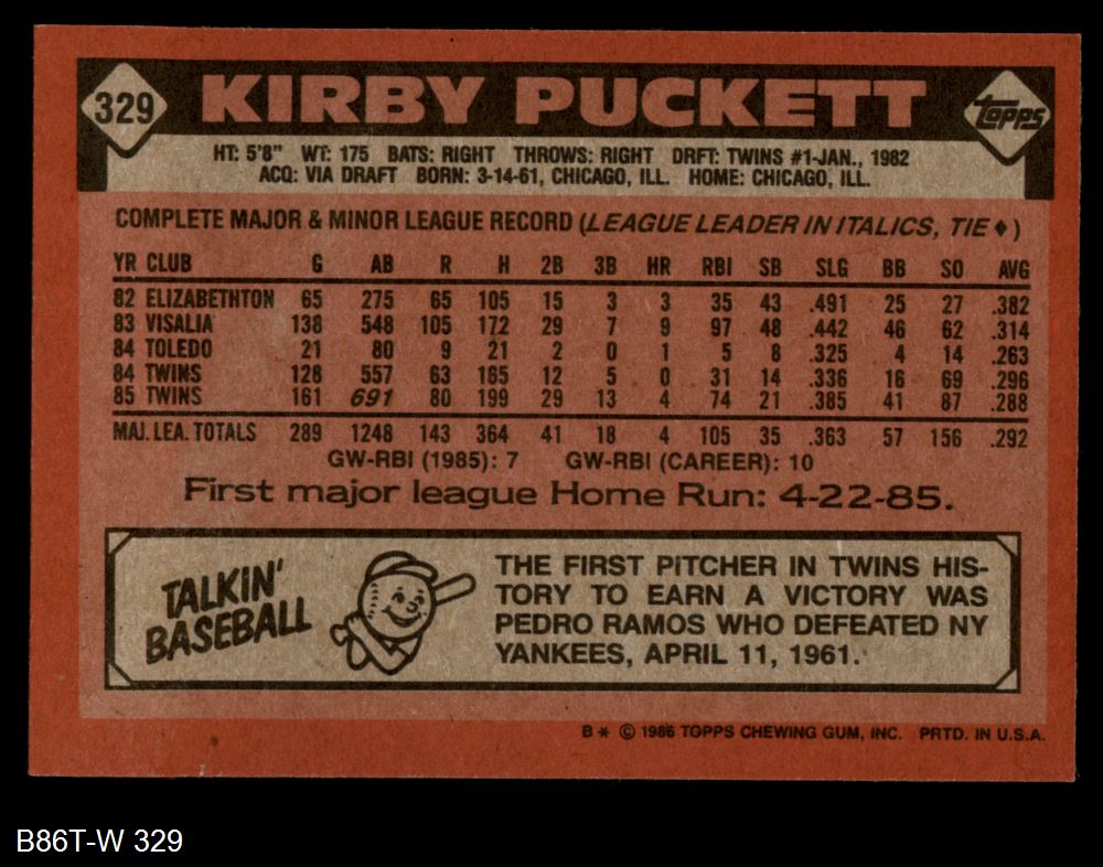 1986 Topps #329 Kirby Puckett 8 - NM/MT