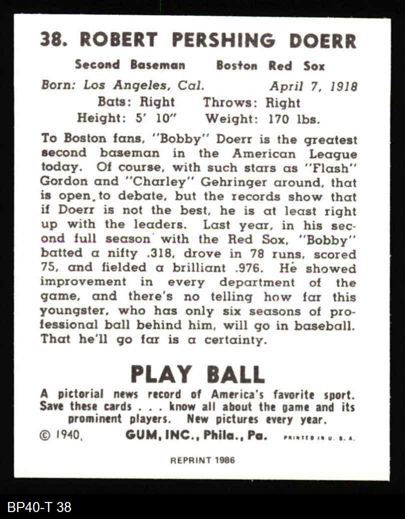 1940 Play Ball Reprint #38 Bobby Doerr 8 - NM/MT