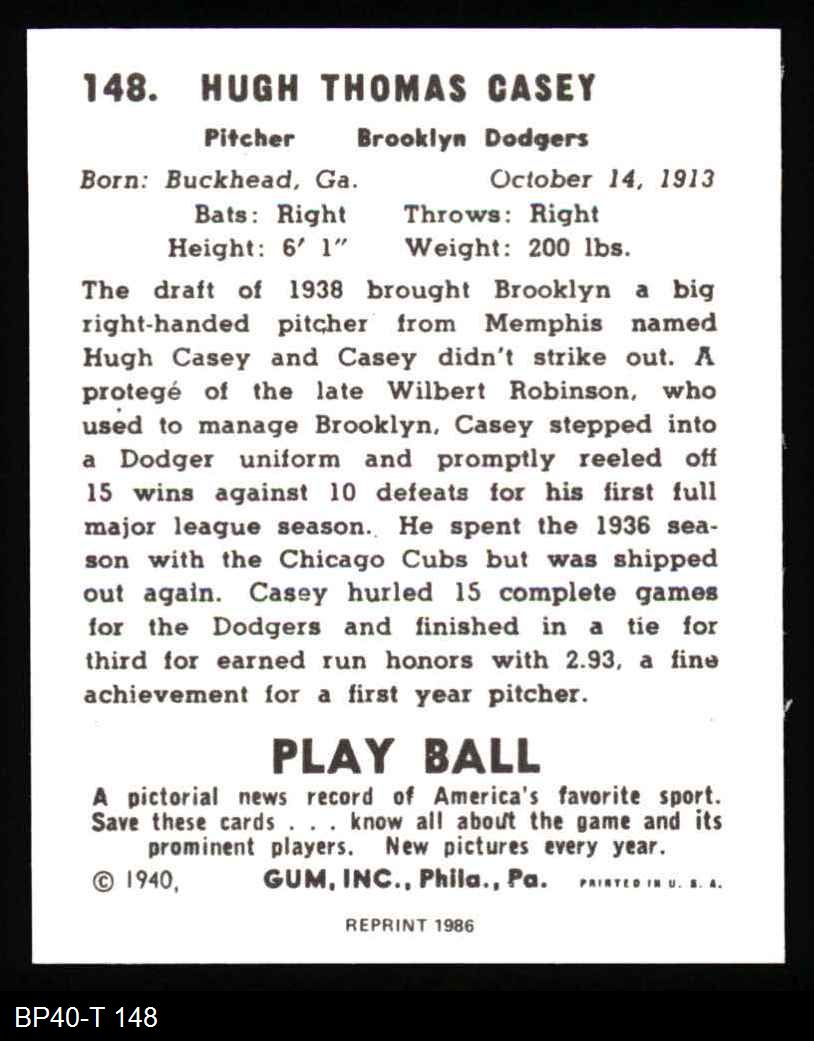 1940 Play Ball Reprint #148 Hugh Casey 8 - NM/MT
