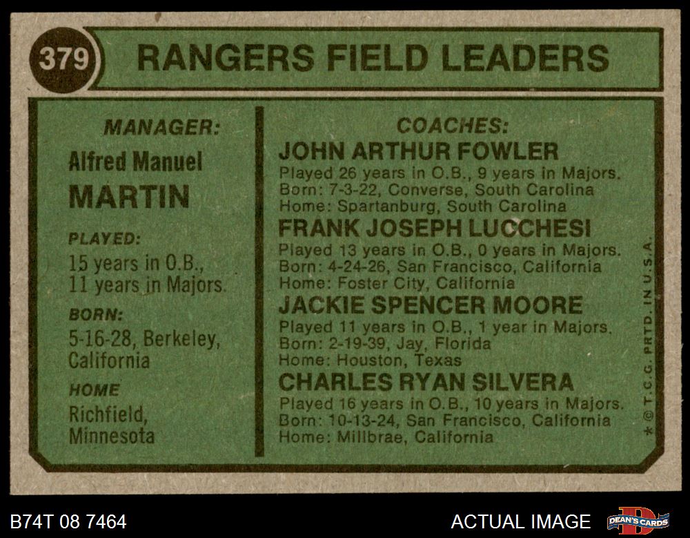 1974 Topps #379 Rangers Leaders