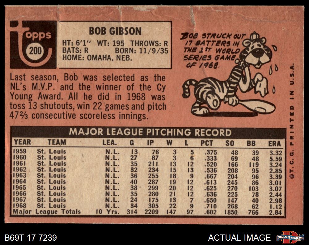 1969 Topps #200 Bob Gibson AUTHENTIC