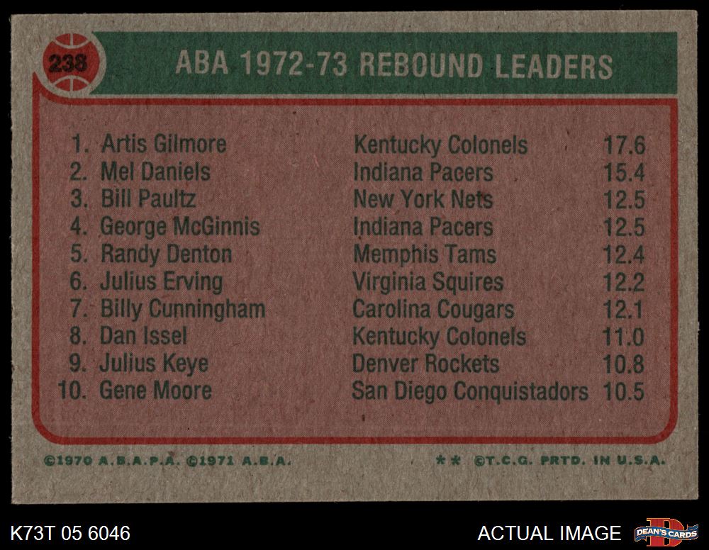 1973 Topps #238 - Artis Gilmore / Mel Daniels / Bill Paultz ABA Rebounds Leaders 8 - NM/MT